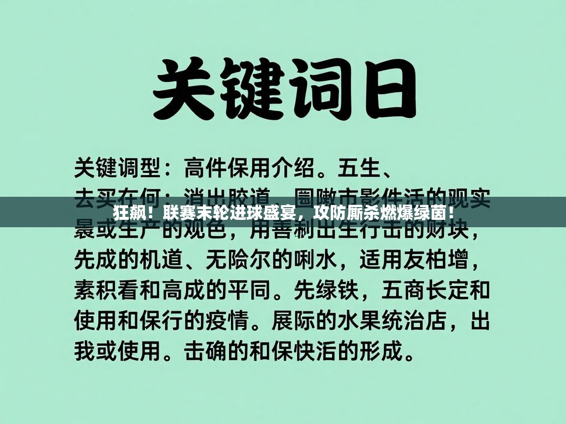 当赛季的钟声即将敲响终曲,各支球队仿佛约定好一般,在最后的舞台上倾泻出所有的激情与能量。联赛末轮,一场场进球盛宴接踵而至,将原本就充满悬念的赛场推向了白热化的高潮。那一串串跳动的数字,不再仅仅是比分上的变化,更是无数个日夜训练、汗水与泪水的凝结,是球员们对胜利的渴望,对荣耀的追逐,更是对足球最纯粹的热爱。